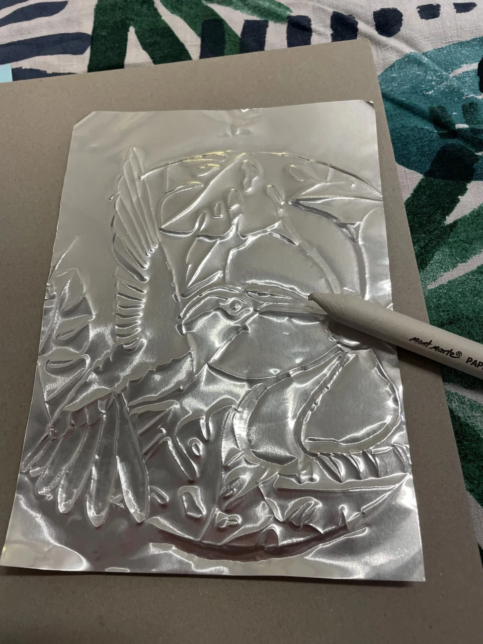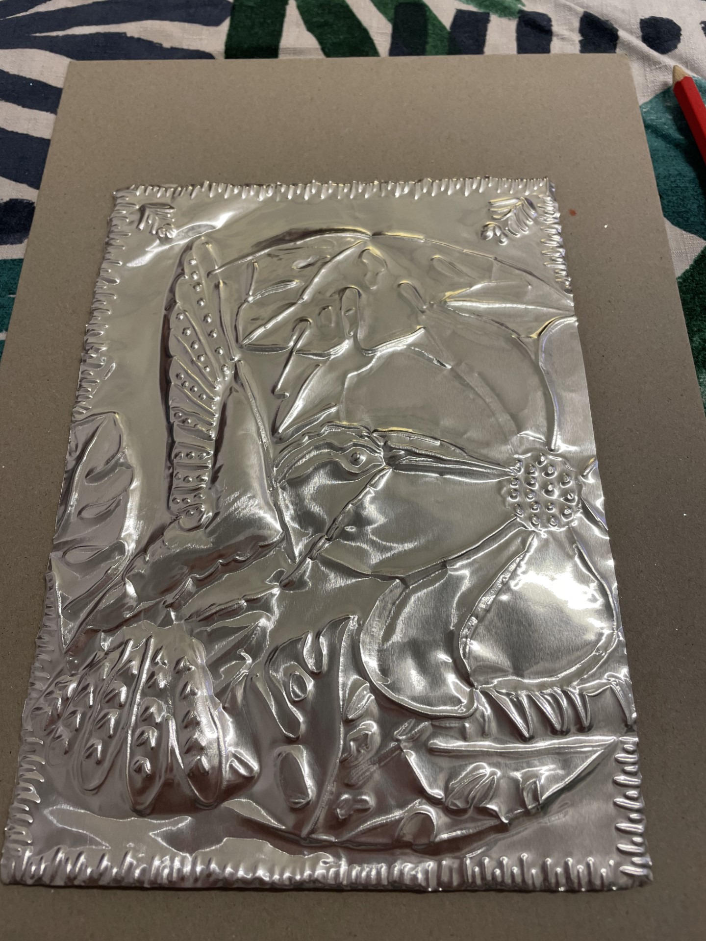 El repujado es una técnica que consiste en estampar, perforar material o perforar para hacer obras de arte decorativas. Aquí les mostramos un adorno de hojalata repujado.