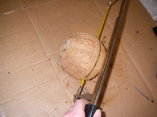 Paso 2: Marcar el coco a la mitad y luego cortarlo hasta obtener dos partes del mismo. Te podrás ayudar con una sierra pequeña.