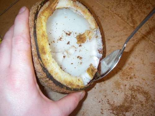 Paso 3: Quitar toda la pulpa del coco con la cuchara, cuidando limpiar bien el interior. Dejar secar un poco la cáscara. Es mejor si lo dejas al menos uno o dos días.