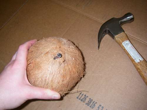 Paso 1: Primero hay que colocar el clavo en el coco para sacar todo el liquido del interior. Entonces deberás poner el coco al revés para que el líquido salga.