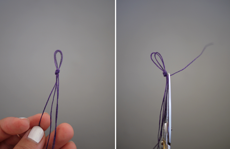 Paso 1: Para comenzar, toma la cuerda y realiza un nudo, tal como se aprecia en la imagen. Corta el cuarto hilo de forma que te queden solo tres.