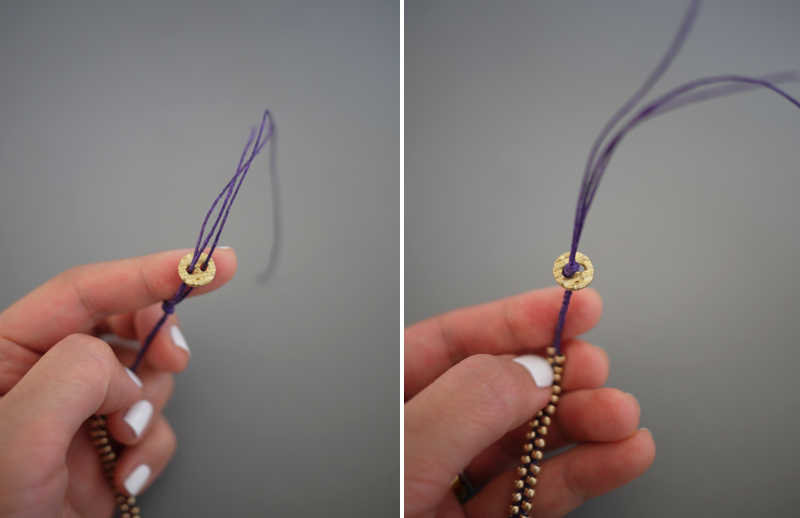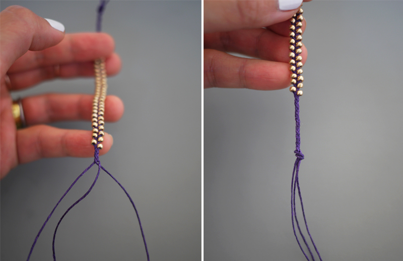 Paso 5: Cuando tengas cubierta toda la parte exterior de la muñeca, podrás dejar de poner cuentas y hacer el trenzado normal para la parte de atrás. Haz un nudo cuando termines.