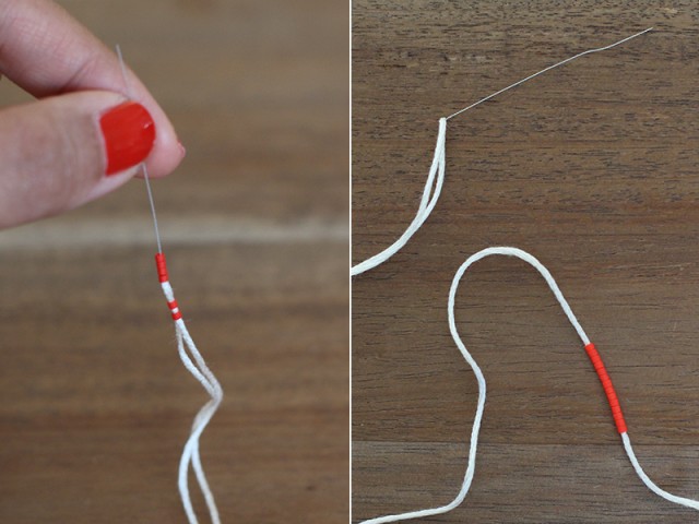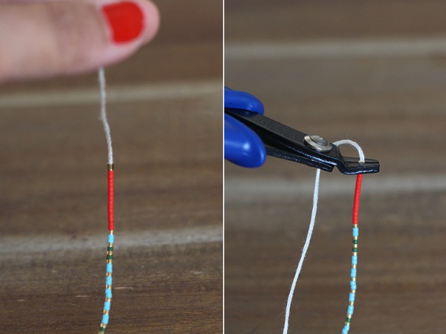 Paso 6: El cierre de la pulsera es simplemente una cuenta pequeña, con una abertura lo suficientemente grande como para deslizarse cómodamente por todo el hilo de bordar y apretar. Pasa ambos extremos del hilo de bordar a través de la aguja. Recorta el exceso de hilo cuando termines.