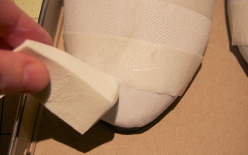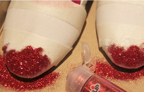 Paso 1: Toma la cinta de pintor y colócala en los lugares del zapatos que no vayas a pintar inmediatamente. Asegúrate de que quede bien pegada para que el glitter no se corra.