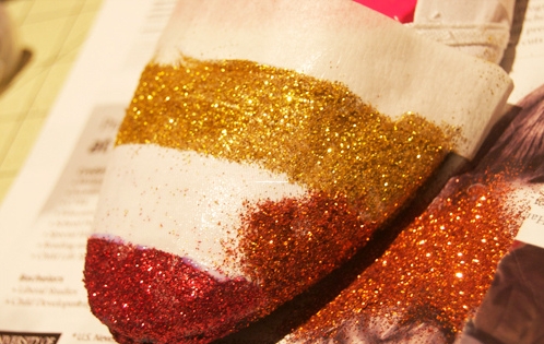 Paso 3: Toma el frasco de glitter y espolvoréalo sobre la zona donde ya habías echado el pegamento. Sacúdelo para que veas cuánto glitter se ha pegado y, si no es suficiente, espolvorea aún más.