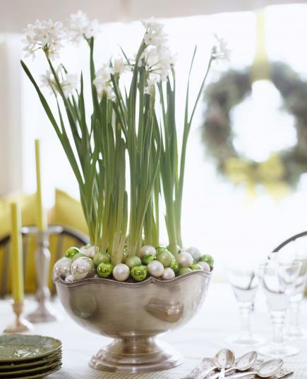 3. Colocar flores en un centro de mesa usando las bolas de Navidad como piedras.