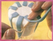 8 – Para los lazos corte dos tiras, una azul y otra verde, luego dele textura con la malla. Dóblelas y presione con los dedos para darle la forma de corbatín.