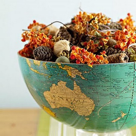 5. Tomar la mitad de un mapa mundi y usarlo como centro de mesa o, si lo prefieres, como macetero.