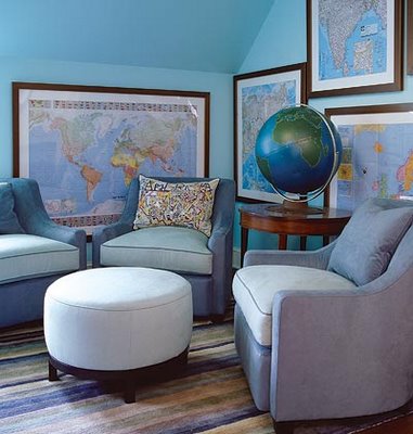 3. Utilizar los mapas para empapelar las paredes. Las opciones son numerosas, todo dependerá de tu creatividad y los mapas que tengas a mano. Como puedes apreciar en las imágenes, es una idea válida lo mismo para una habitación que para el rincón de trabajo.
