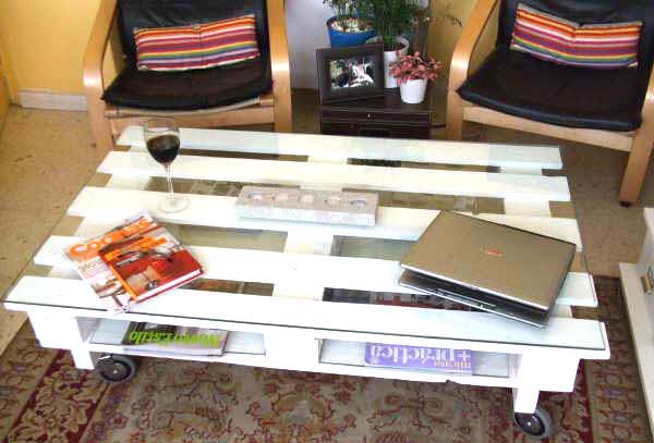 4. Mesa. En este caso le colocaron unas rueditas y la pintaron pero también las he visto sin ruedas y con un barniz que resalta el color de la madera y el resultado es genial. Solo deberás colocarle un cristal encima.