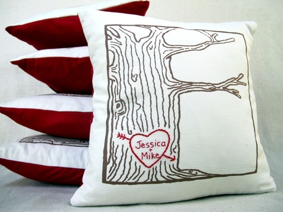 2. Cojines con nombres personalizables. En vez de grabar sus nombres en la corteza de un árbol, ¿por qué no hacerlo en un cojín? Etsy te permite introducir tu nombre y el de tu amada.