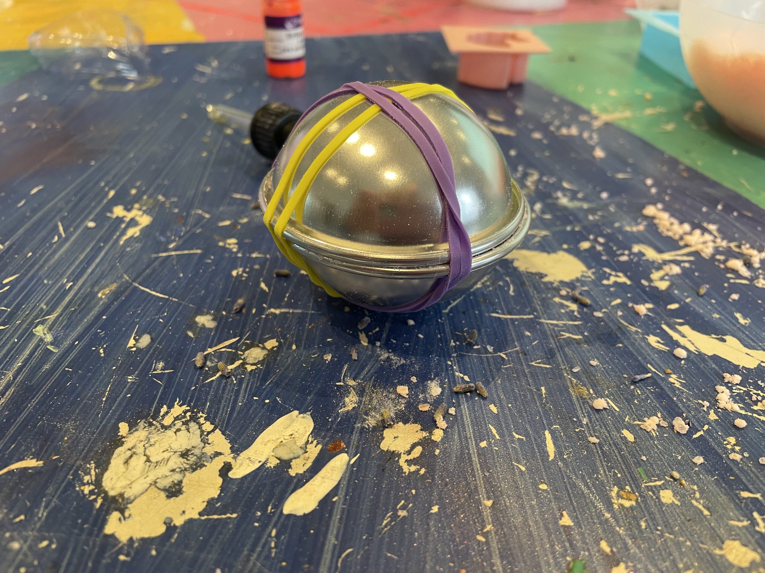 Luego haz lo mismo en el otro 1/2 molde. Conecta las dos mitades y empuja las juntas. Luego asegura el molde con algunas bandas de goma.