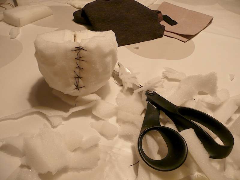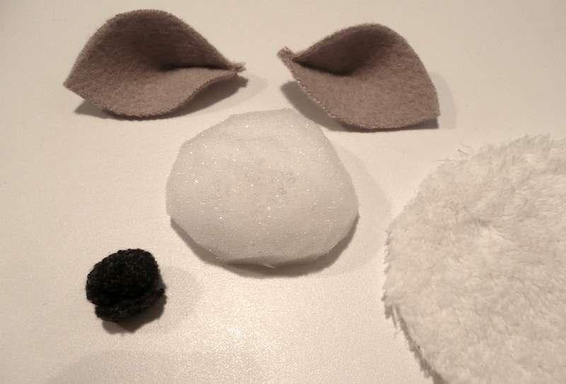 Paso 7: Recorta un poco de espuma de poliuretano de forma redonda para darle forma a la cabeza del muñeco. Recorta un poco de la tela esponjosa blanca y cubre con ella la pelota que has acabado de hacer, cose por detrás. Realiza estos mismos pasos para formar la nariz pero cúbrela con una tela de color oscuro.