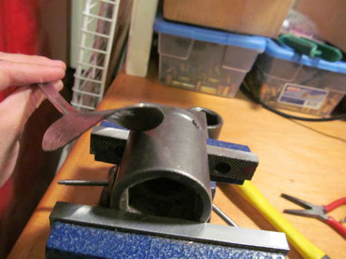 Paso 2: Luego, con la ayuda del martillo y apoyando la cuchara en la superficie redonda (tubo) se le confiere la forma curva necesaria para que se parezca a un calzador. Si el metal resulta demasiado duro que no permite ser trabajado, se deberá calentar un poco usando el fuego.