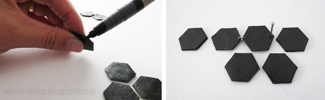 Paso 3: Ahora realiza unos pequeños agujeros en cada uno de los hexágonos, será por donde pases el alambre. Una vez que lo hayas pasado y consigas la forma que buscabas, usa la pinza para cerrar bien el alambre y que la figura no se deshaga.