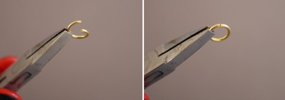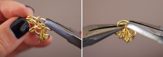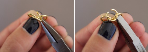 Paso 3: Manteniendo sujetos los anillos con el dedo índice y el pulgar, cogemos un anillo abierto y lo enganchamos en la parte delantera de los dos anillos.