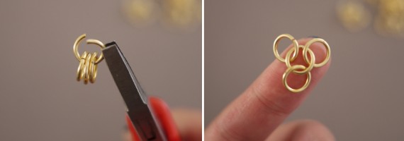 Paso 2: Ponemos tres anillos cerrados en un anillo abierto. Luego cerramos el anillo y abrimos los anillos exactamente como se puede ver en la imagen que aparece a continuación. El anillo de abajo será el final del collar mientras los otros dos anillos de arriba estarán donde comienza la malla de la cadena.
