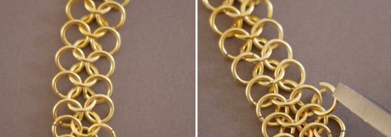Paso 7: Para añadir una cuarta línea opcional, ponemos el collar sobre una mesa y engancharemos un anillo abierto en el primero y segundo anillo de la parte derecha. Cerramos. Añadimos otro anillo abierto en el tercero y cuarto anillo y seguimos así. ¿Puedes ver que se está formando un patrón?