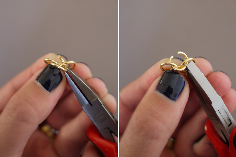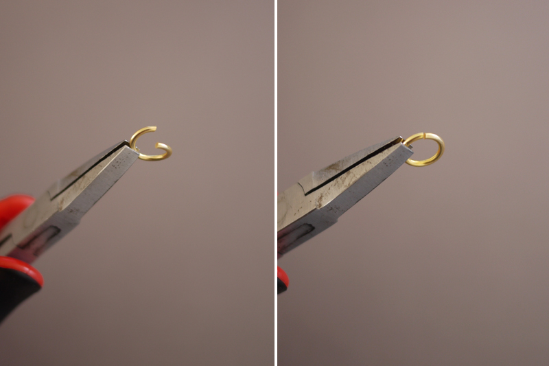 Paso 3: Manteniendo sujetos los anillos con el dedo índice y el pulgar, cogemos un anillo abierto y lo enganchamos en la parte delantera de los dos anillos.