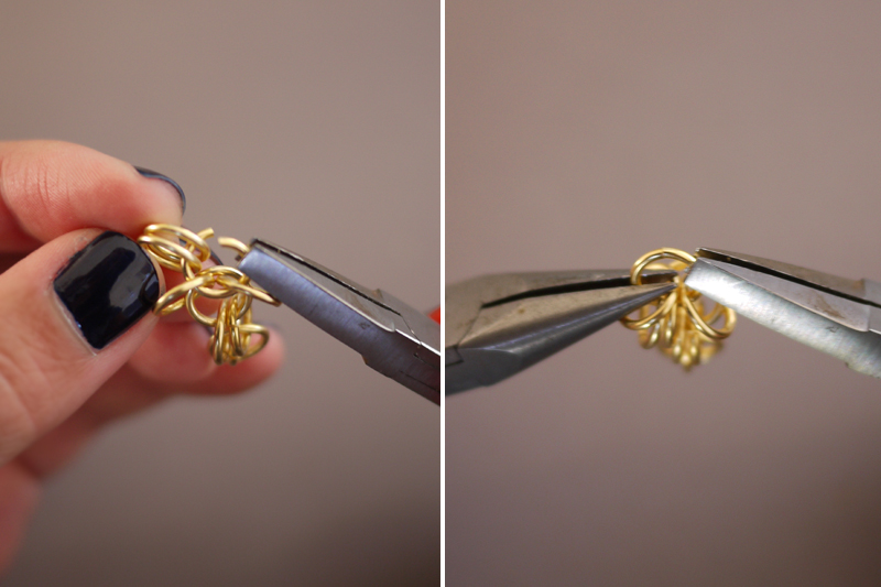 Paso 2: Ponemos tres anillos cerrados en un anillo abierto. Luego cerramos el anillo y abrimos los anillos exactamente como se puede ver en la imagen que aparece a continuación. El anillo de abajo será el final del collar mientras los otros dos anillos de arriba estarán donde comienza la malla de la cadena.