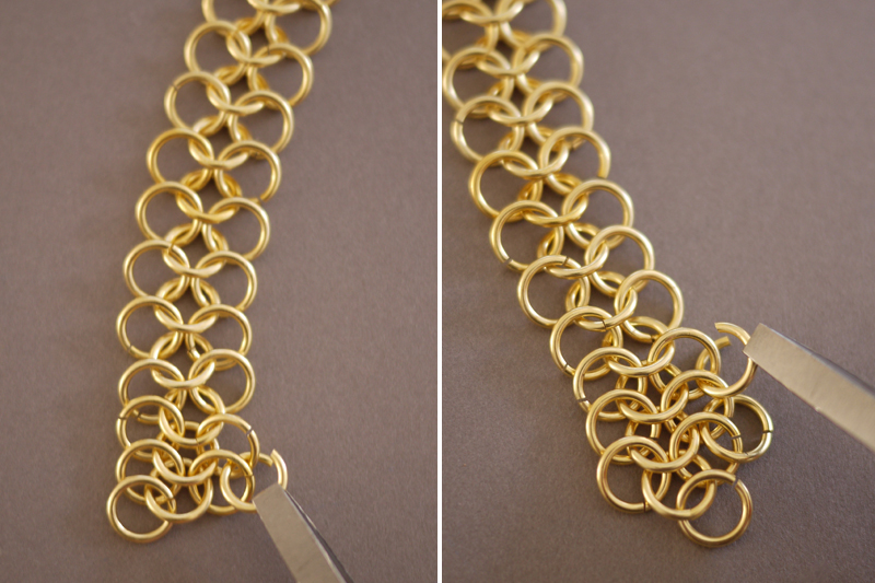 Paso 7: Para añadir una cuarta línea opcional, ponemos el collar sobre una mesa y engancharemos un anillo abierto en el primero y segundo anillo de la parte derecha. Cerramos. Añadimos otro anillo abierto en el tercero y cuarto anillo y seguimos así. ¿Puedes ver que se está formando un patrón?