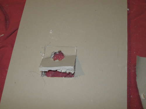 Paso 3: Poner el cuadro encima y en el centro del agujero que deseamos tapar y marcar el contorno del cuadro en la pared. Luego debemos cortar y eliminar todo el material alrededor del hueco dejando la forma que calce a la perfección con el cuadro que hemos realizado anteriormente.