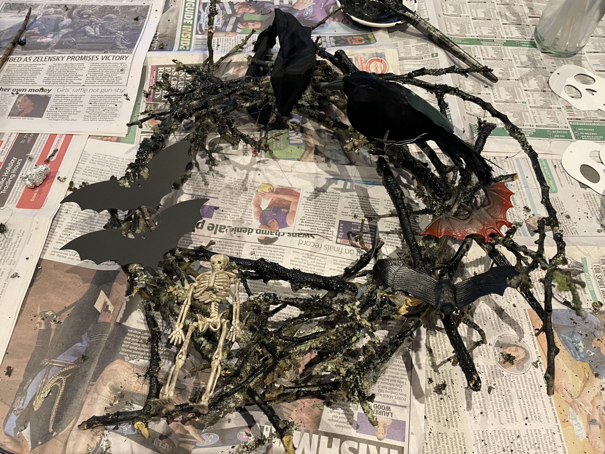 Paso 6: ¡Agrega tus espeluznantes decoraciones de Halloween! Distribuilas alrededor de la corona y pegalas con pegamento caliente.