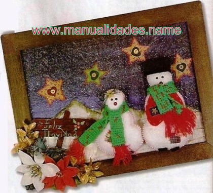 5-Ubica los muñecos de nieve sobre el cuadro y fíjalos con silicona. Ten en cuenta no aplicar demasiado para que los grumos no se noten.