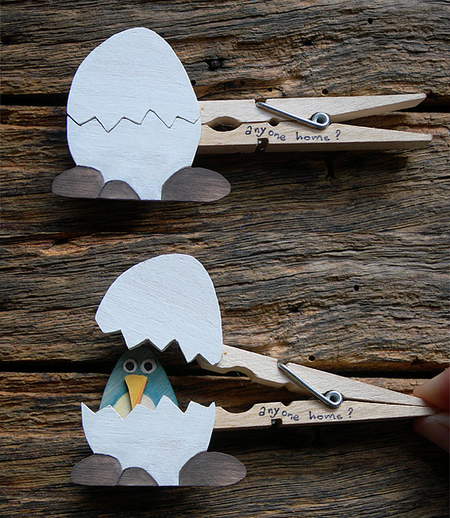 Paso 4: Pega cada parte del huevo en uno de los lados de la pinza para la ropa. De esta forma, cuando esté cerrada, veremos el huevo cerrado pero al abrirla, veremos que aparece el pollito.
