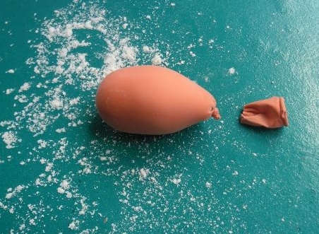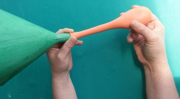 Primero deberás colocar el embudo en la boca del globo ya que a través de este podrás hacer pasar la taza de harina. Puede ser que necesites un palito o un lápiz para empujar la harina y hacerla entrar en el globo. Cada cierto tiempo, deberás estirar el globo ya que así podrá entrar la harina con más facilidad.