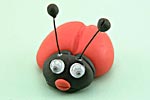 La vaquita de san antonio se puede realizar con moldes (como muestra la foto) o bien realizarla tu misma (ver video: Vaquita de San Antonio en Porcelana Fria). Los ojos se pegan con cola vinílica.