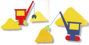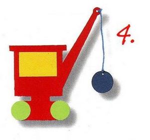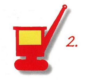 1- Recorta la grúa en goma EVA roja, y las ruedas en verde. Para la pinza utiliza azul y amarillo para la ventana.