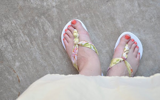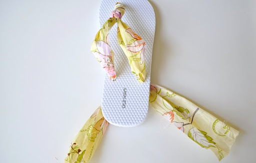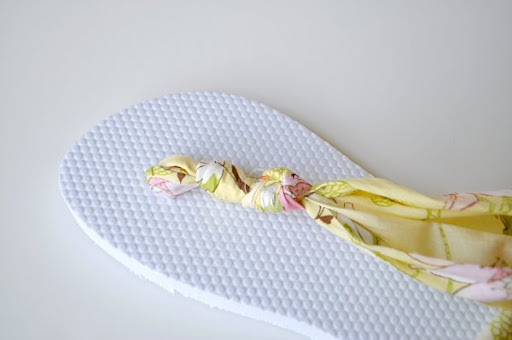 Paso 6: Ahora simplemente toma cada uno de los extremos de la tela y pásalos por los otros dos agujeros de las chanclas. Haz un nudo y recorta lo que sobre.