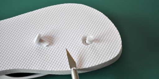 Paso 1: Elimina los tapones de goma que sostienen las tiras de las chanclas. Si te ayudas de un cutter será mucho más fácil.