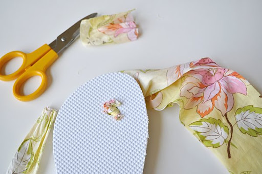 Paso 3: Toma dos retazos de la tela, corta en pico uno de sus extremos y únelos. Después, pásalos a través del agujero de las chanclas. Tal y como se aprecia en la imagen.