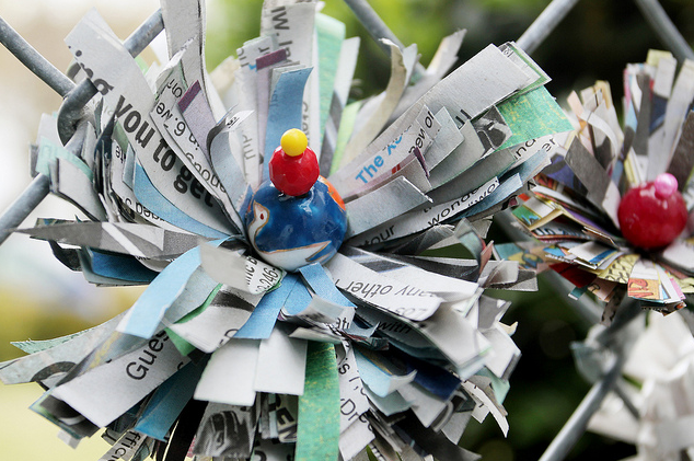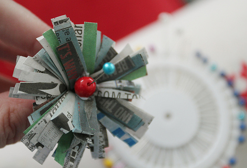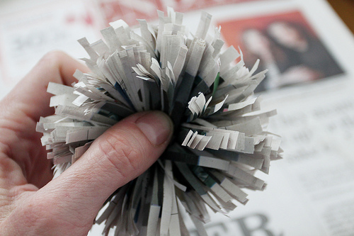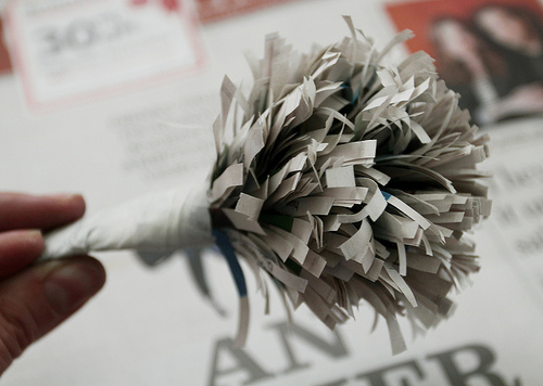 Toma un extremo del periódico cortado en forma de peine y envuelve con papel, siempre en torno al centro del papel. Envuelve tres o cuatro veces y asegúralo con la cinta. Localiza el centro con el pulgar y presiona suavemente los “dientes” de forma que se abran los “pétalos”.