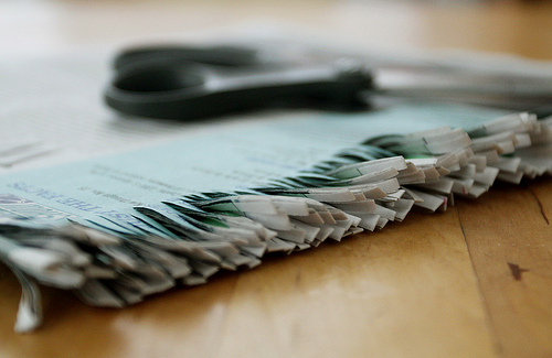 Toma las tijeras y realiza pequeños cortes en paralelo a lo largo del papel. A continuación, corta el periódico de forma perpendicular a los “dientes” que has realizado, dejando aproximadamente una pulgada de espacio entre los dientes y el corte. Cuando hayas terminado de cortar, el periódico debe semejar un peine.