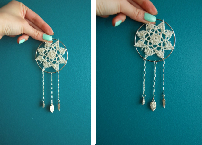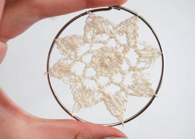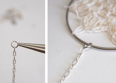 Paso 2: Utiliza uno de los anillos para añadir la cadena a uno de los extremos del anillo mayor donde ya has colocado el tejido crochet. Sería ideal si ñadieses tres cadenas.