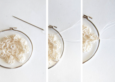 Paso 1: Ayudándote con el hilo y la aguja, sujeta la confección a los extremos del anillo grande.