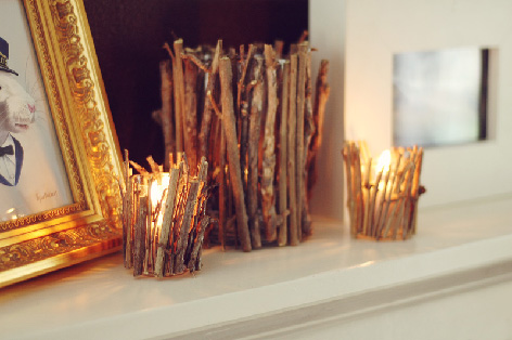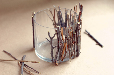 En este punto no te queda sino ir pegando cada una de las ramas al vaso hasta que lo cubras todo. Deberás tener el cuidado de dejar pequeñas aberturas entre una y otra ya que así podrá pasar la luz de la vela. Aunque si usas ramitas naturales iguales a las que se aprecian en la figura, esto no será un problema ya que normalmente estas no son del todo rectas.