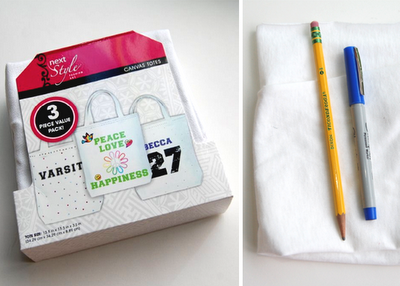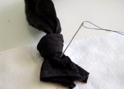 Paso 9: Cosemos los trozos de media al lienzo para crear las asas. Repetimos en el otro lado y el bolso estará listo.
