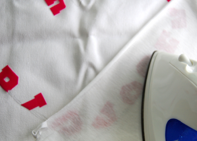 Paso 6: Aplicamos las letras en el corazón en la misma posición que estaban antes y luego ponemos la tela de camiseta encima, a continuación pasamos la plancha caliente para fijarlas en el lienzo.