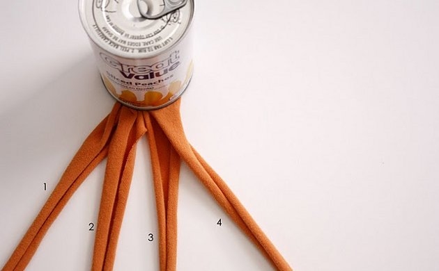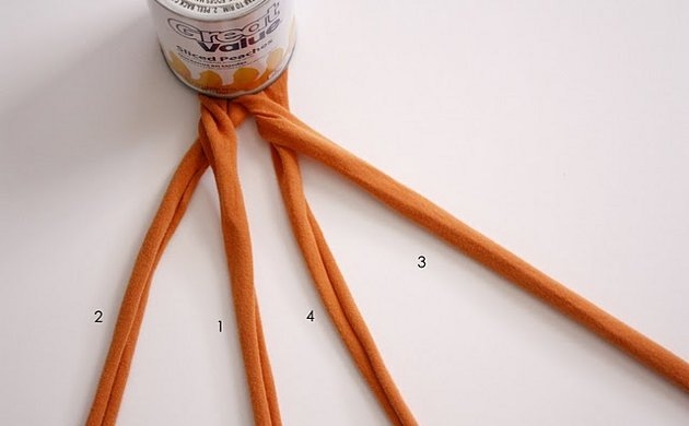 El primer paso será cortar cuatro tiras de aproximadamente cinco centímetros de ancho, justo de la parte inferior de la camiseta.