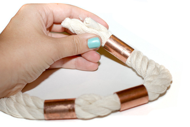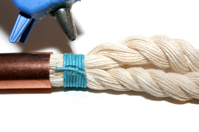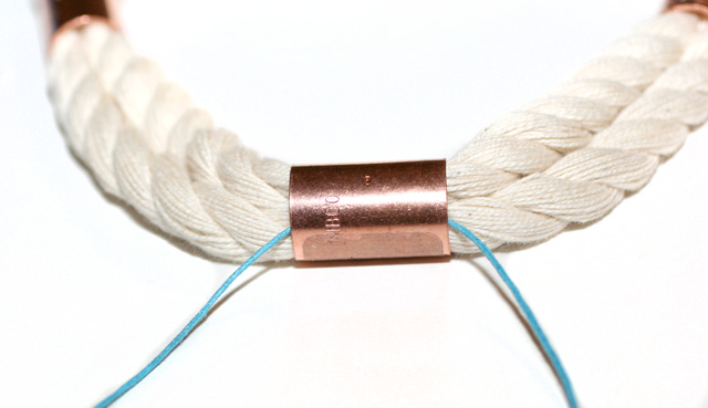 Paso 1: Doblamos la cuerda gruesa e insertamos los tubos de cobre, cuidando ponerlos a la distancia justa. Tal y como se aprecia en la imagen.