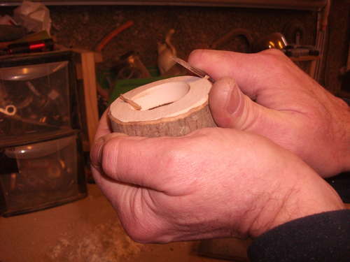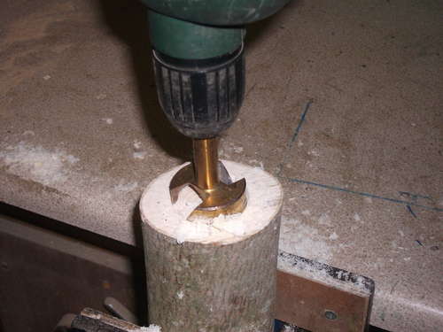 Paso 3: Después se taladra el trozo de madera con la broca de 40 mm penetrando en profundidad pero no más que 15 ó 20 mm.