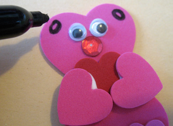 Paso 5: Pega una lentejuela roja para hacer la nariz, añade los ojos movibles y usa un marcador negro para crear las orejitas.