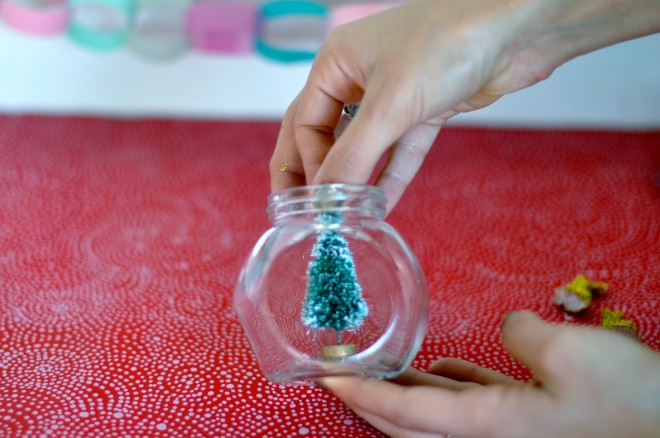 Paso 1: En este caso, nos decantamos por unos conejitos pero puedes usar los animales o figuras que prefieras. Primero toma el árbol de Navidad y, aplicándole un poco de pegamento en la base, sujétalo al fondo del frasco que hayas elegido.