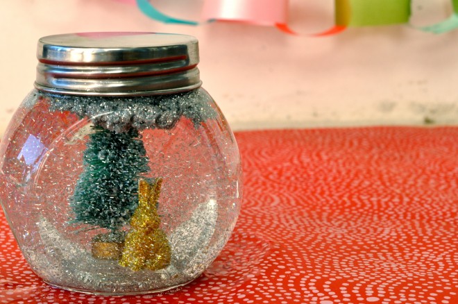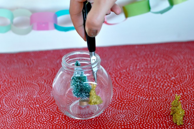 Paso 4: Una vez que hayas colocado todas las figuras, llena el frasco con agua y añade unas gotas de glicerina líquida y un cucharadita de purpurina (preferiblemente blanca para que simule la nieve).