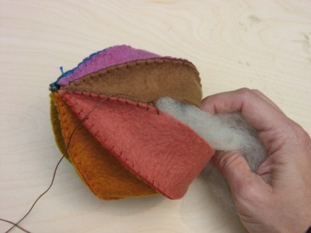Paso 3: Deja un tramo sin coser e introduce el algodón que servirá de relleno. Recuerda añadirle mucho para que la pelota tenga la firmeza adecuada.