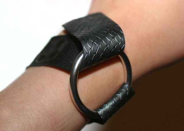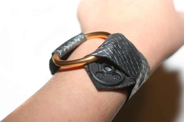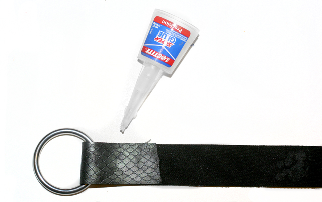 Paso 1: Lo primero será sujetar un extremo de la cinta de cuero a la argolla de metal. Para ello usarás simplemente un poco de pegamento.